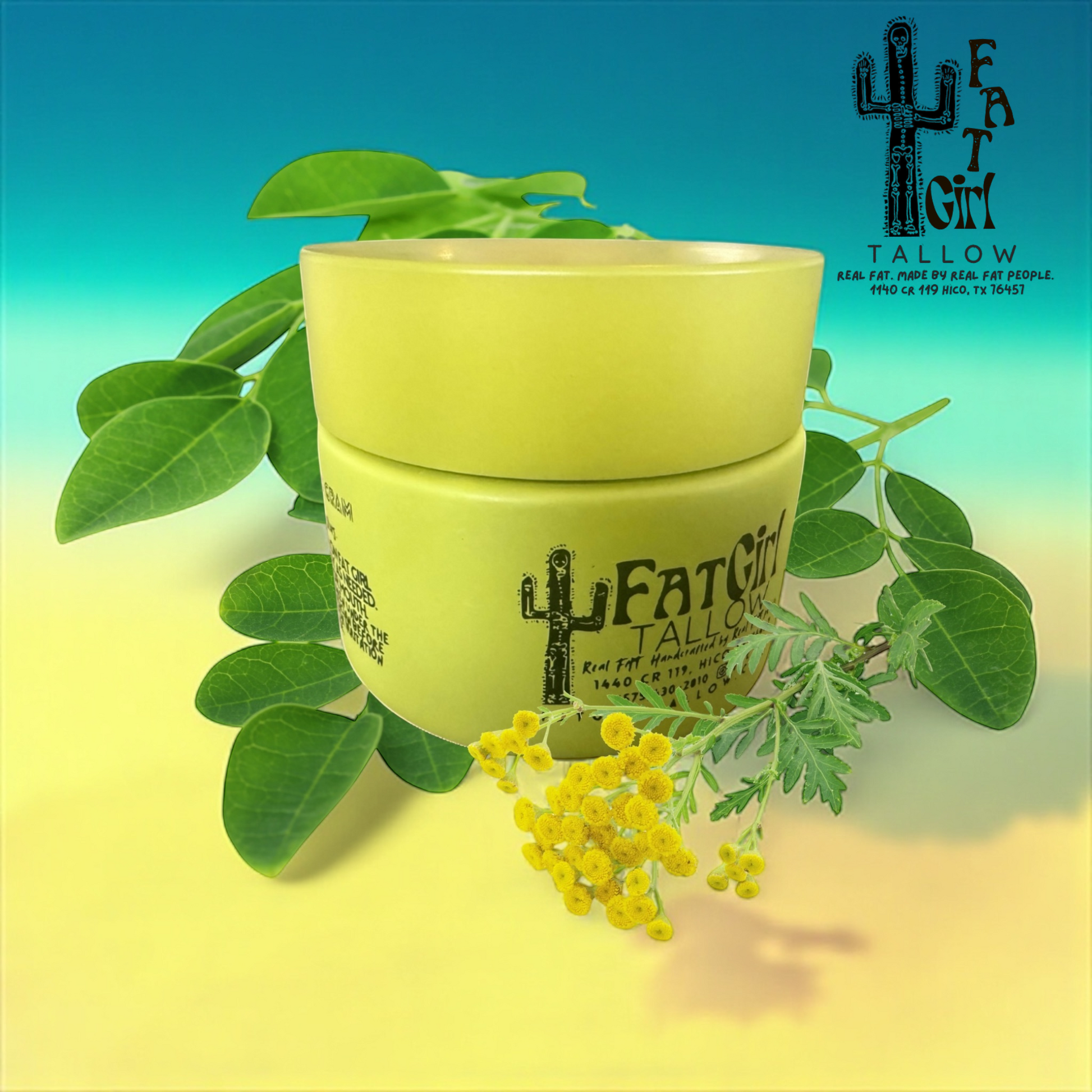 Ingredients: Locally Sourced grassfed Beef Tallow, Organic Olive Oil, moringa oil, Vitamin E Oil, Pure therapeutic grade blue Tansy Essential Oils, ethically sourced mica.