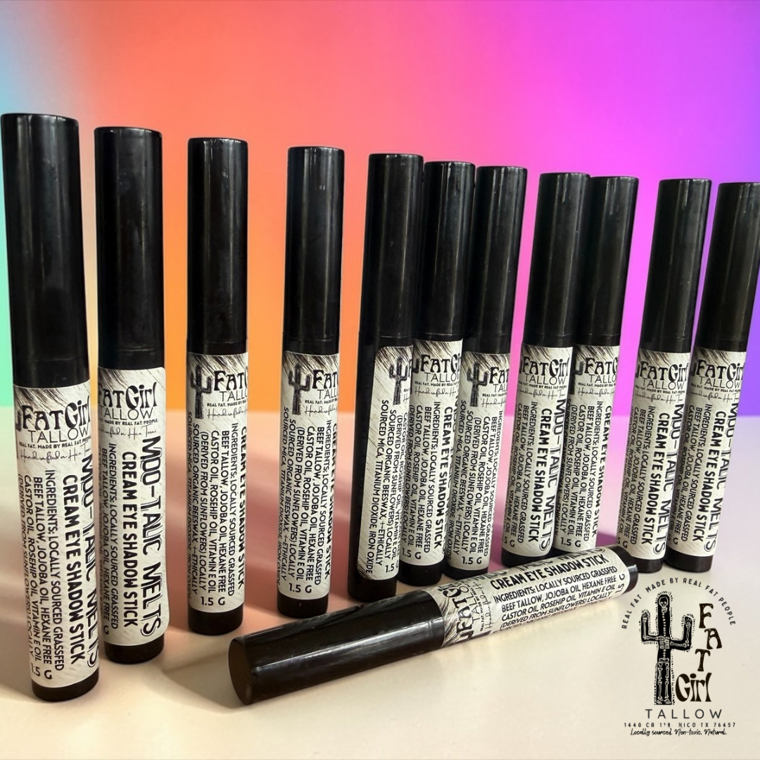 ⬆️far out! bro like totally gets it! But let us not forget to mention; HYDRATING! We’ve infused our Moo-Tallic Melts with Rose Hip Oil to minimize fine lines and reduce the look of dark circles, whilst brightening and giving your eyes (cheeks or lips) hella epic glow! Moo-Tallic Melts are the perfect accompaniment to our existing line of non-toxic, tallow based beauty products here at Fat Girl Tallow. Perfect for sensitive eyes and skin- our natural formulation of cream eyeshadow will leave your skin glowing and healthy! 💚