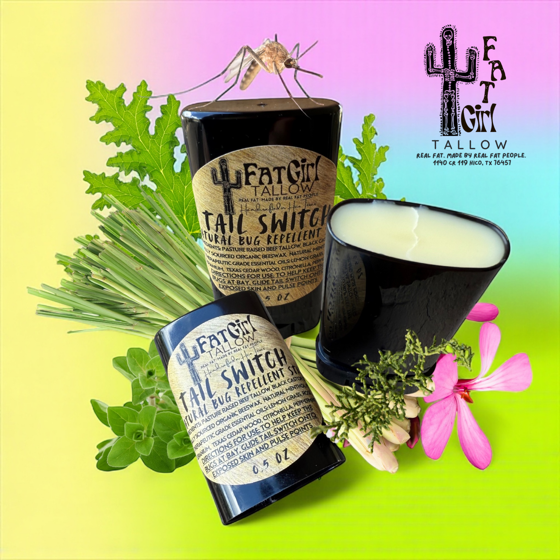 A: if your answer is anything other than the blood sucking winged, seasonal, vampires that haunt our skies (aka the mosquito) …. you’d be WRONG! Help naturally deter these demonic entities and their pesky distant cousins (gnats, flies, no see ums) with Fat Girl Tallow’s Tail Switch Bug Repellent stick. Loaded with everything bugs detest- Tail Switch is a great non toxic, natural, locally sourced and SWEAT resistant option that you can apply directly to your skin.